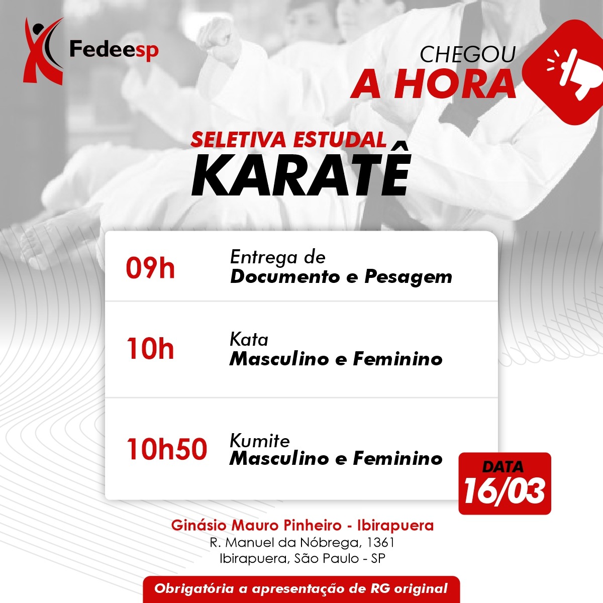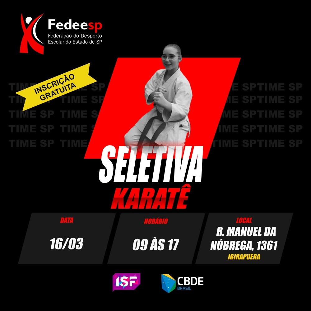 A Seletiva Estadual de Karatê Escolar para os Jogos Escolares Brasileiros Sub 18, será realizada na dia 16 de março de 2024, no Completo Esportivo do Ibirapuera, Rua Manoel da Nóbrega, 1361– São Paulo/SP.